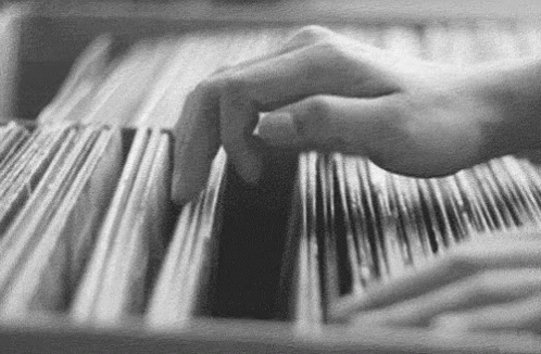Paglalarawan ng Content: a black and white photo of a person 's hand reaching into a drawer full of records