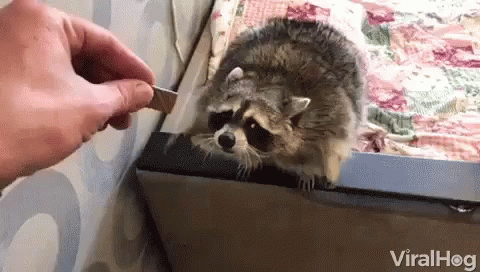 Paglalarawan ng Content: a raccoon is sitting on a bed while a person feeds it a piece of food .