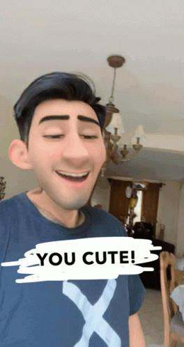 Paglalarawan ng Content: a man wearing a blue shirt with the letter x on it says you cute
