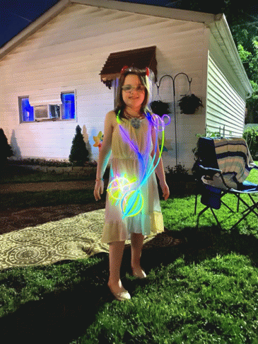 Paglalarawan ng Content: a little girl in a white dress is standing in front of a house