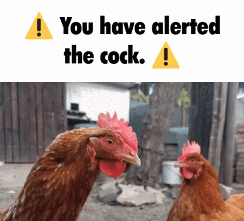 Paglalarawan ng Content: two chickens standing next to each other with a warning sign above them that says you have alerted the cock