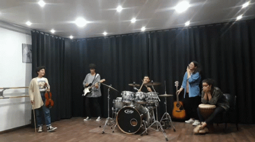 Paglalarawan ng Content: a group of people are playing instruments in a room with a drum set that says ' zildjian ' on it