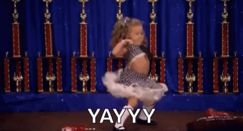 Paglalarawan ng Content: a little girl in a tutu is dancing in front of trophies and the words yayyy are above her .
