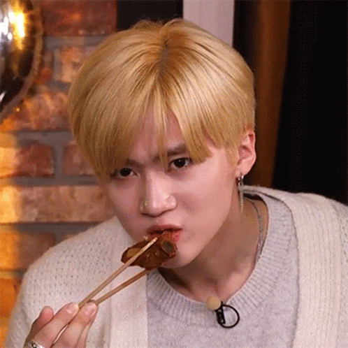 Paglalarawan ng Content: a young man with blonde hair is eating a piece of meat with chopsticks