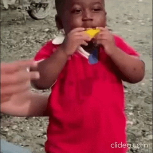 Paglalarawan ng Content: a young boy in a red shirt is eating a piece of lemon .