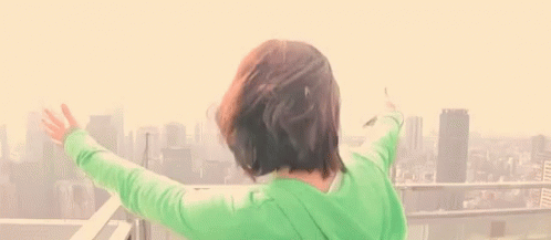 Paglalarawan ng Content: a woman in a green sweater is standing on a balcony with her arms outstretched in front of a city .