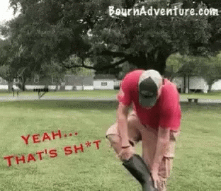 Paglalarawan ng Content: a man wearing a red shirt and a hat is putting on a pair of rubber boots in a park .
