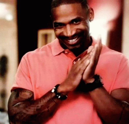 Paglalarawan ng Content: a man in a pink shirt is clapping his hands while smiling .