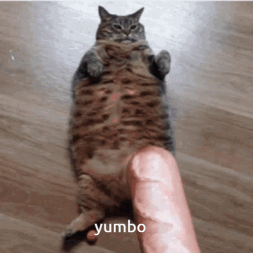 Paglalarawan ng Content: a cat is laying on its back next to a person 's leg and the word yumbo is on the bottom of the picture