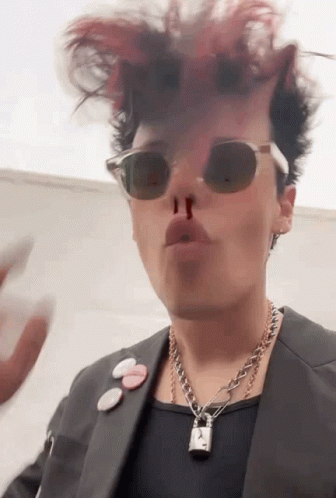 Paglalarawan ng Content: a person wearing sunglasses and a necklace has blood coming out of their nose