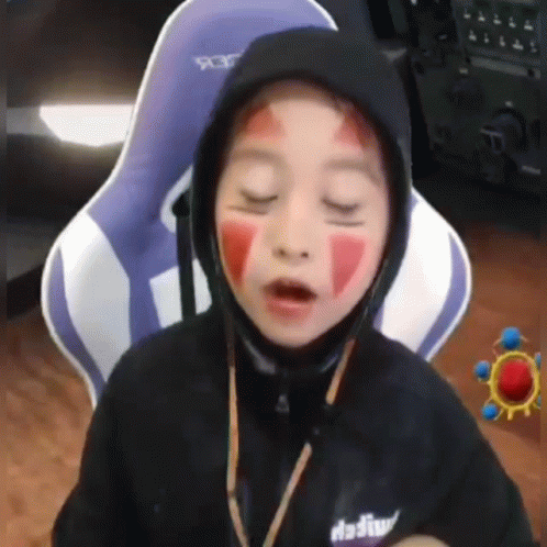 Paglalarawan ng Content: a young boy with red paint on his face is wearing a hooded jacket and sitting in a chair .