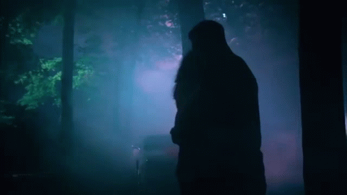 Paglalarawan ng Content: a person is standing in a dark forest with blue smoke coming from the trees