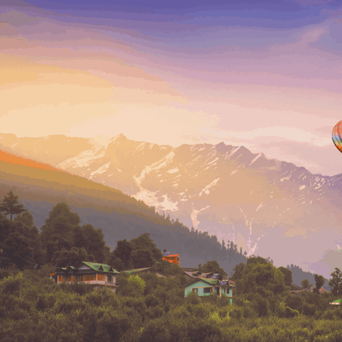 Paglalarawan ng Content: a colorful hot air balloon is flying over a mountain range