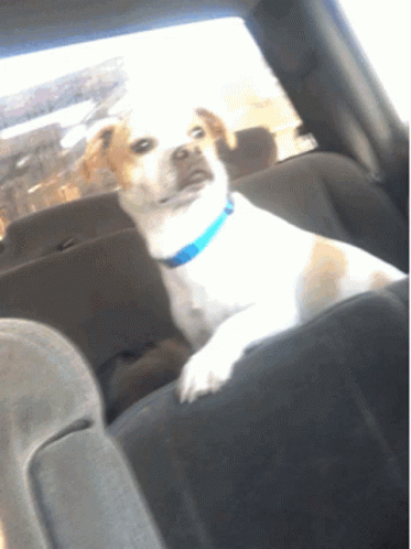 Description du contenu: a small brown and white dog with a blue collar is sitting in the back seat of a car