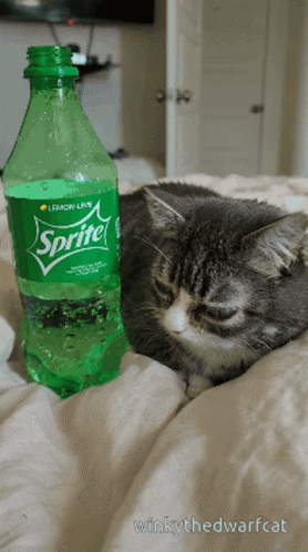 Description du contenu: a cat laying on a bed next to a bottle of sprite