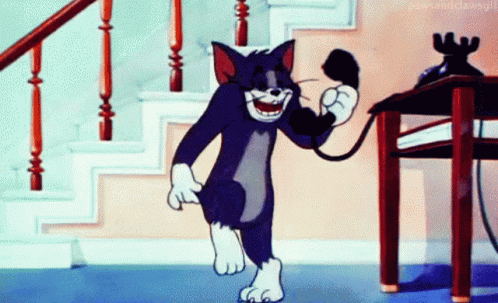 ការពណ៌នាអំពីខ្លឹមសារ: a cartoon of tom talking on a phone while walking down stairs