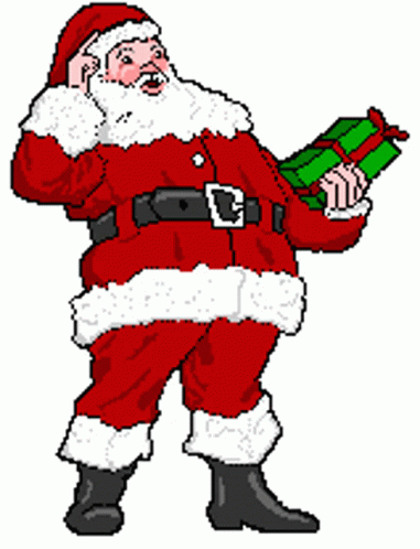 ការពណ៌នាអំពីខ្លឹមសារ: a pixel art of santa claus talking on a cell phone while holding a gift box