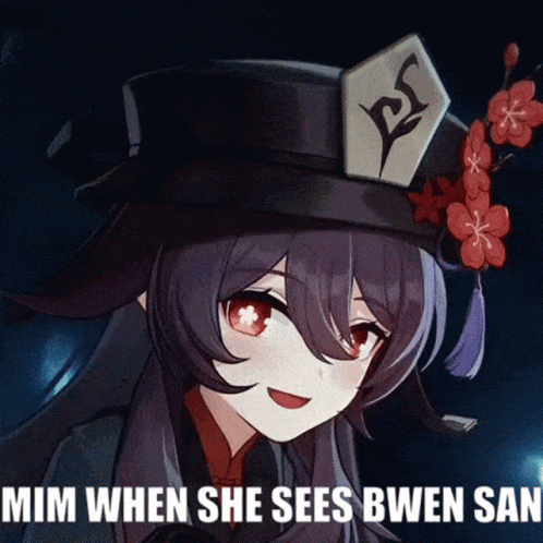 콘텐츠 설명: a close up of a girl wearing a top hat with flowers in her hair and the words mimi when she sees bwen san