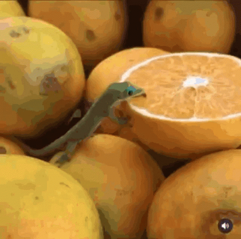 კონტენტის აღწერა: a lizard is eating a slice of orange in a pile of oranges