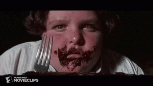 კონტენტის აღწერა: a boy with chocolate on his face is holding a fork in front of his mouth .