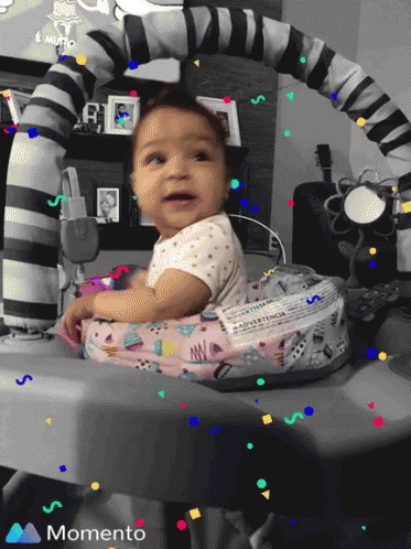 Контент сипаттамасы: a baby is sitting in a walker with confetti around her and the word momento on the bottom right