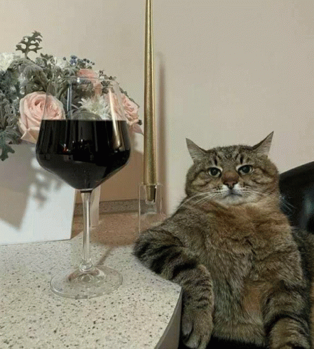 Контент сипаттамасы: a cat sits next to a glass of wine on a table