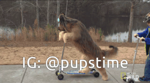 Контент сипаттамасы: a dog is riding a scooter with a caption that says ig @pupstime