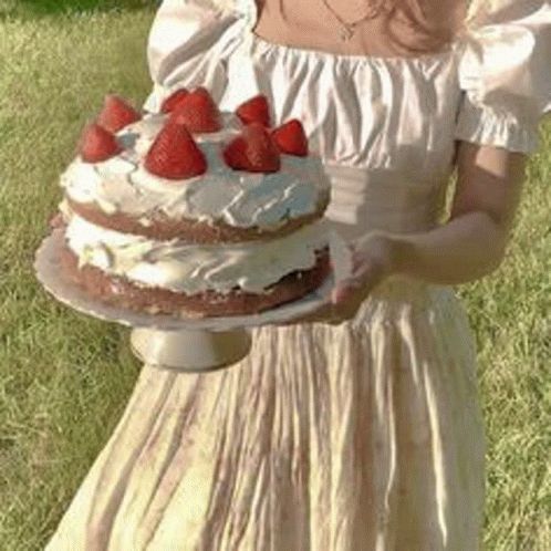 Контент сипаттамасы: a woman in a dress is holding a cake with strawberries on top .