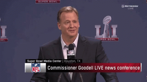 Контент сипаттамасы: a man in a suit stands in front of a super bowl media center in houston
