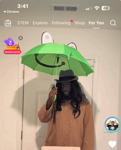 Контент сипаттамасы: a man holding a green umbrella with a smiley face on it in front of a door that says summer picnic