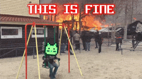 Контент сипаттамасы: a pixelated image of a child on a swing with the words " this is fine " above him