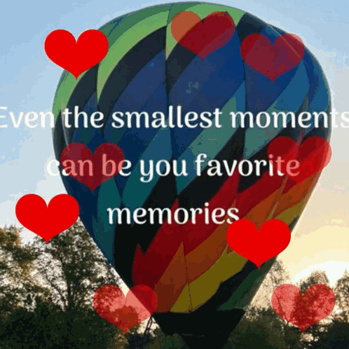 Контент сипаттамасы: a hot air balloon is surrounded by red hearts and the words " even the smallest moments can be your favorite memories "