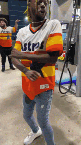 कॉन्टेंट की जानकारी: a man wearing a jersey that says astros is standing in front of a gas pump