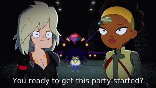 कॉन्टेंट की जानकारी: two cartoon characters are standing next to each other with the words " you ready to get this party started "
