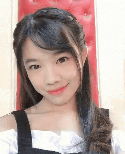 कॉन्टेंट की जानकारी: a young girl is taking a selfie in front of a red couch