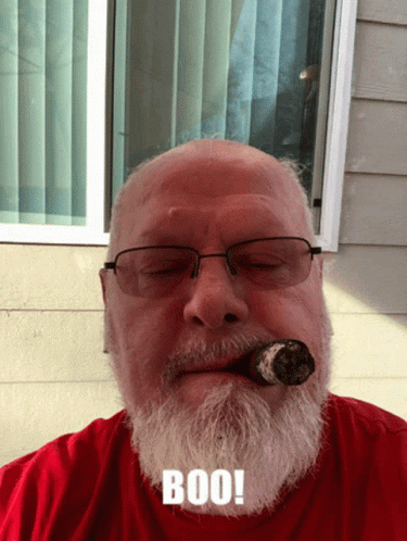 Tartalomleírás: a man with a beard and glasses is smoking a cigar and the word boo is on the bottom