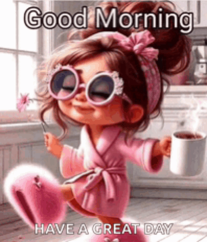 Tartalomleírás: a cartoon girl in a pink robe is holding a cup of coffee and a flower .