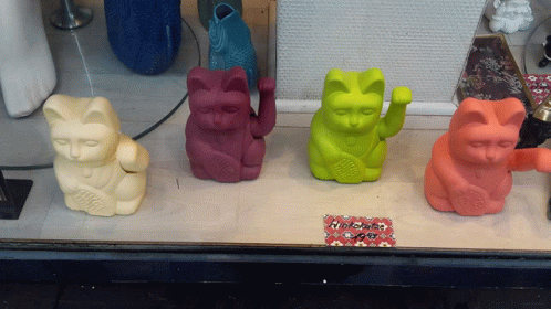Tartalomleírás: four different colored cats are sitting on a table with a sign that says nikkeicafe on it