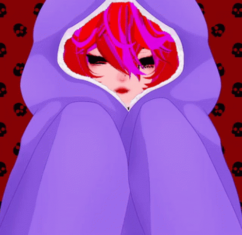 Tartalomleírás: a cartoon girl with red hair is wrapped in a purple blanket