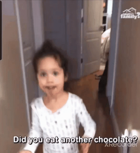 Deskripsi Konten: a little girl with chocolate on her face says did you eat another chocolate ?