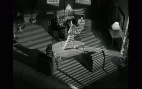 Deskripsi Konten: a black and white photo of a living room with a woman dancing
