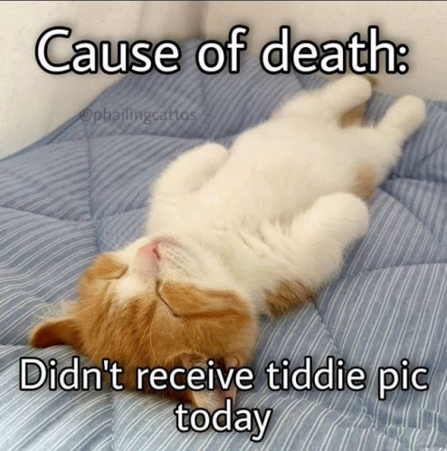 Lýsing á efni: a kitten is laying on its back on a bed with the caption cause of death didn 't receive tiddie pic today