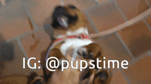 Lýsing á efni: a brown and white dog on a leash with the hashtag ig @pupstime below it