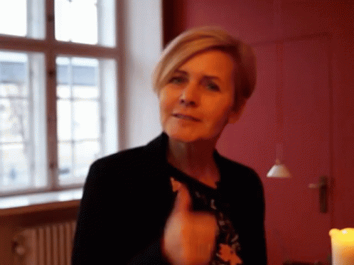 Lýsing á efni: a woman giving a thumbs up in front of a red wall