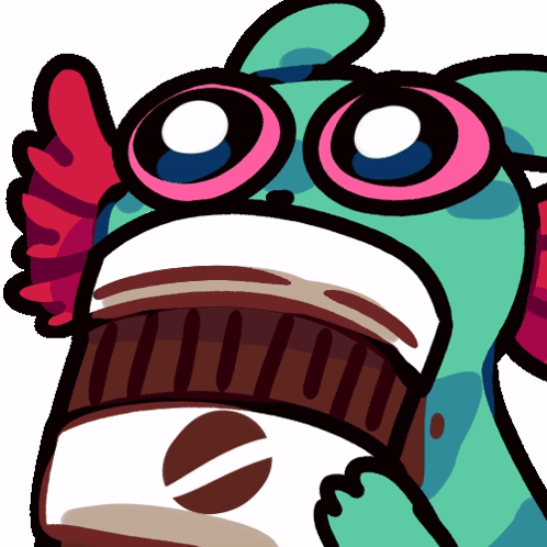 Lýsing á efni: a cartoon monster holding a cup of coffee with a coffee bean on it