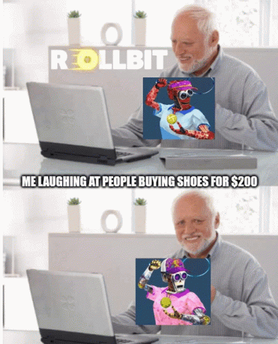 Lýsing á efni: an elderly man is laughing at people buying shoes for 200 dollars