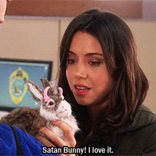 コンテンツの説明: a woman is holding a stuffed bunny and saying " satan bunny ! i love it "