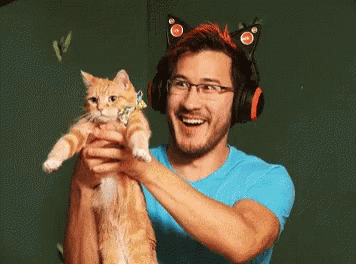 コンテンツの説明: a man wearing headphones holds an orange cat in his arms