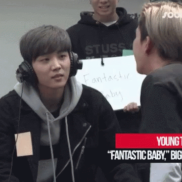 ຄຳອະທິບາຍເນື້ອຫາ: a young man wearing headphones holds a sign that says fantastic baby