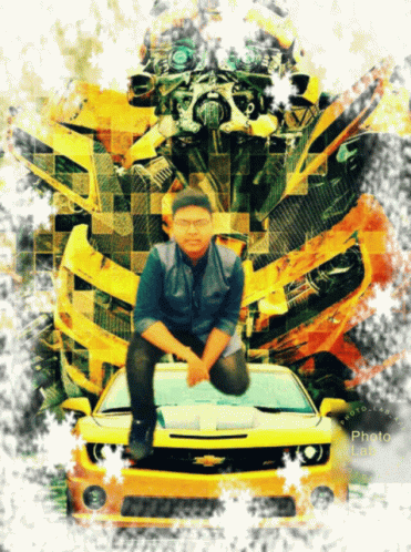 ຄຳອະທິບາຍເນື້ອຫາ: a man kneeling on top of a yellow car with a robot behind him